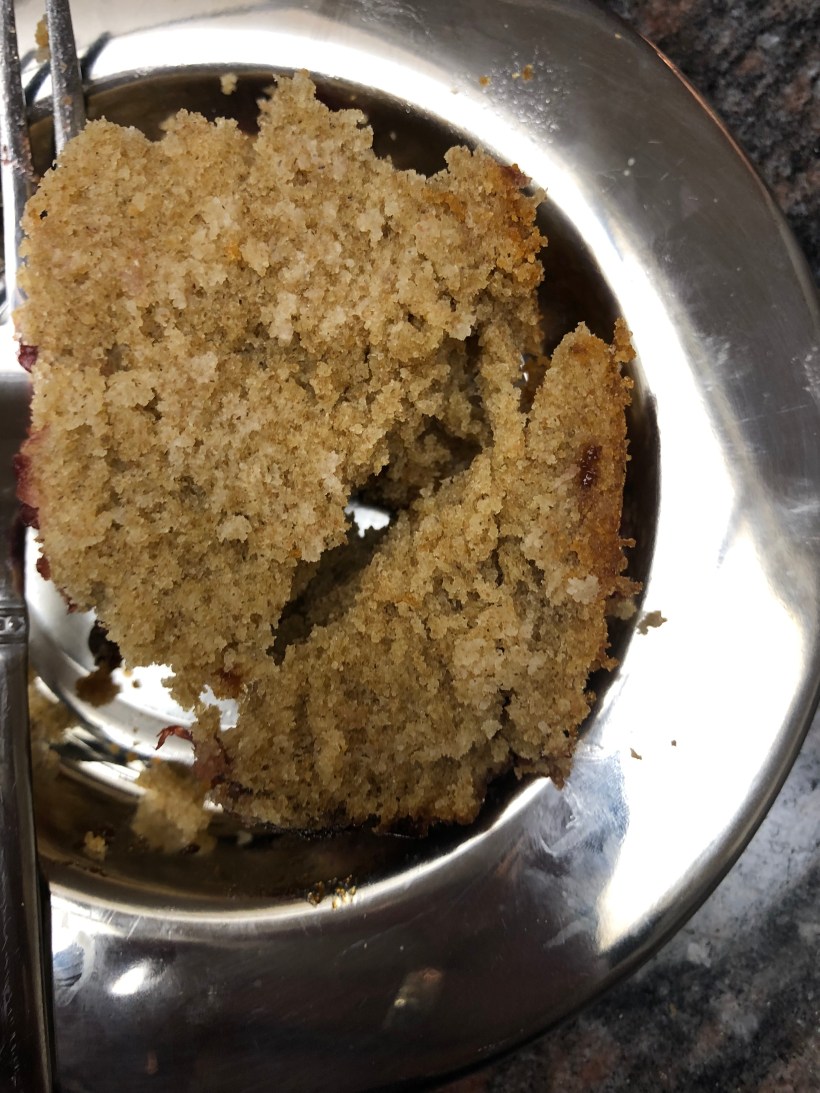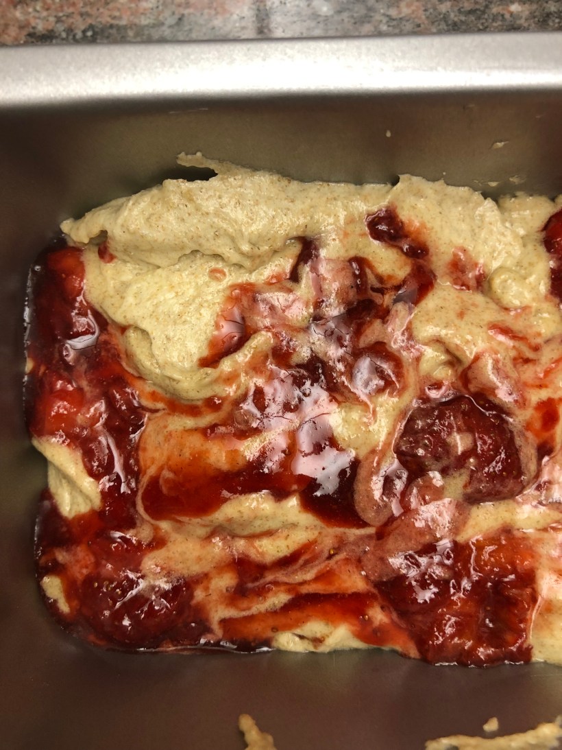 I have to say that the flavor blew me away – it is like a pound cake, not too sweet and the combination with the strawberries just works. I did modify the recipe – Adriana made a strawberry glaze but I ended up cooking up some strawberries with sugar and making a rough strawberry jam to put on top of the loaf. I also cut back the sugar.